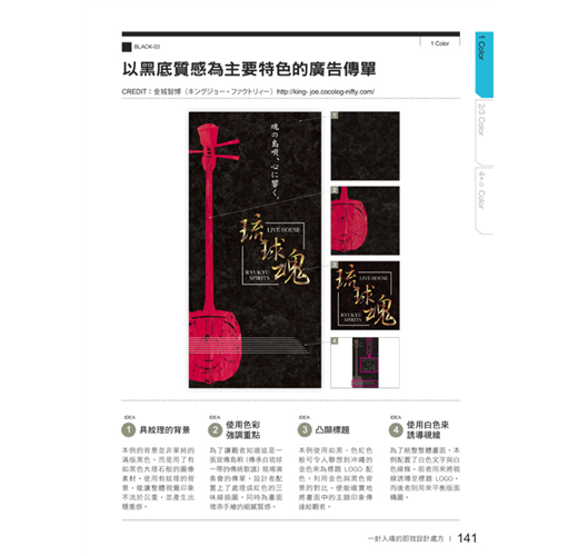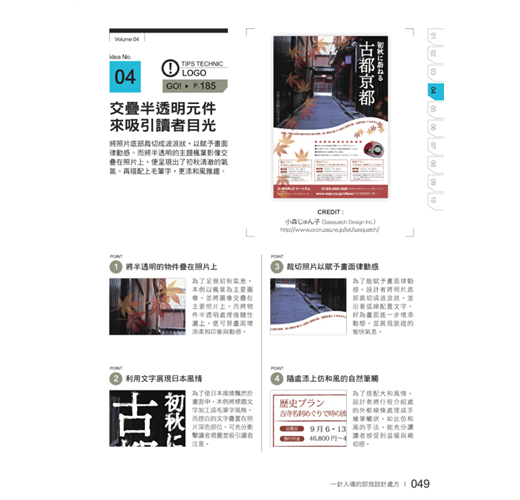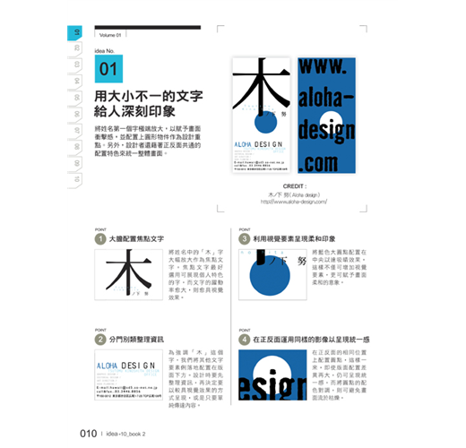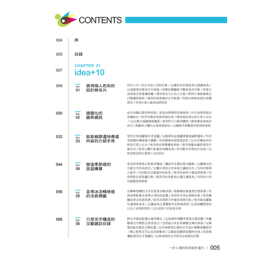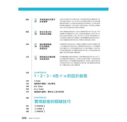 身為此書編輯,實在忍不住要用這樣看似不專業但實則真情流露的句子來推薦此書。想想,要找這麼多位專業設計師參與創作就很不容易了,這些日本人竟然硬生生的就這樣弄出了 10 個題目,還讓設計師們替每個題目生出 10 個創意十足的範例。其中包括了:「展現個人色彩的設計師名片」、「視覺化的圖表資訊」、「能鉅細靡遺地傳遞內容的介紹手冊」、「營造季節感的旅遊傳單」、「呈現冰涼暢快感的冷飲標籤」、「只用文字構成的文藝雜誌目錄」、「具高級感的洋果子店宣傳單」…等等,連「破除尷尬的便秘藥包裝盒設計」也有 10 種創意作品 Show 給你看呢!更可怕的是,這 10×10 個 idea 還只佔了全書的三分之一!後面還有一堆配色實例、設計 QA,與操作技巧補充耶~