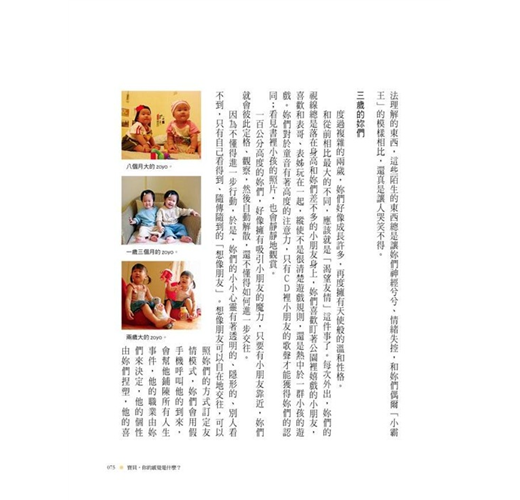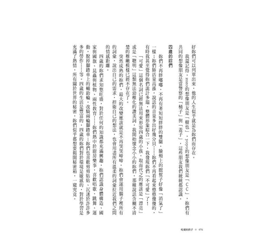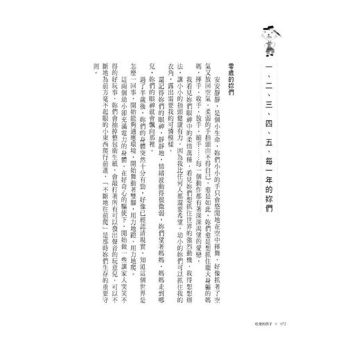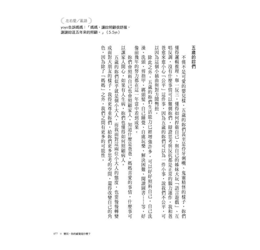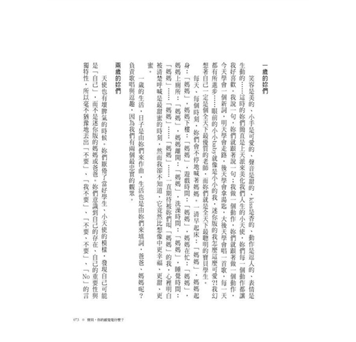 這本書雖是親子書,但我卻看到Selena自我對話,那敏感的心在面對孩子中,卻又保留了自己。〈讓孩子看見另一個妳〉,我發現Selena追求的自我實現需求;〈我的信用差點破產〉、〈放下那萬惡的食指〉,更提醒自己身為母親的自省及學習。