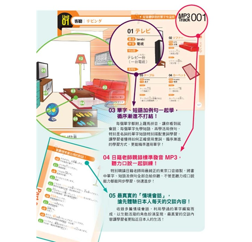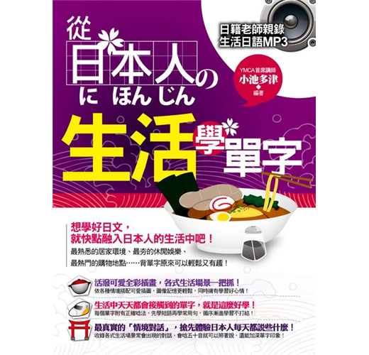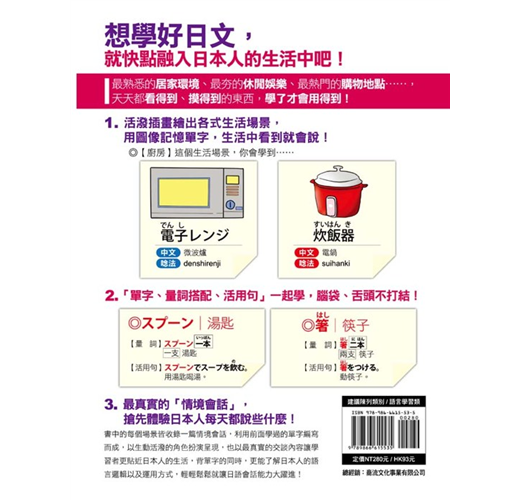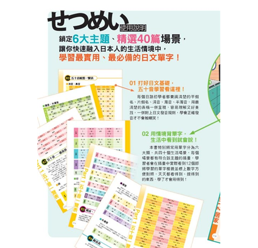 總是覺得語言的學習很死板,久而久之變成一種壓力嗎?!《從日本人的生活學單字》一書特別將常用單字分為六大類,共四十個生活場景,每個場景都有符合該主題的插畫,學習者會在插畫中實際看到12個即將學習的單字樣貌,並標上數字方便對照,把天天都看得到、摸得到的東西,透過圖像來記憶其單字,學習才會更輕鬆、更有趣!