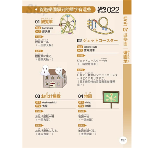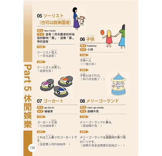 背了單字更要知道怎麼活用,才是正確的學習方式!每一個要學習的單字都會附上羅馬拼音,讓你看到就會說;每個單字先學短語,再學活用例句,特別是名詞的單字短語特別搭配量詞學習,讓學習者懂得如何正確使用量詞,循序漸進的學習方式,更能精準運用單字!