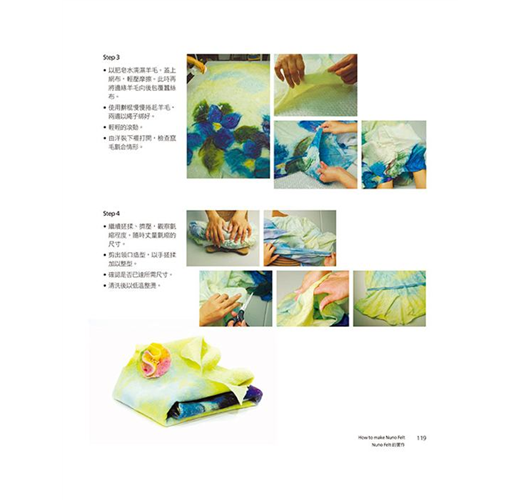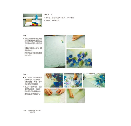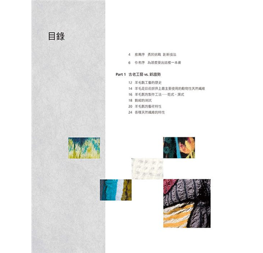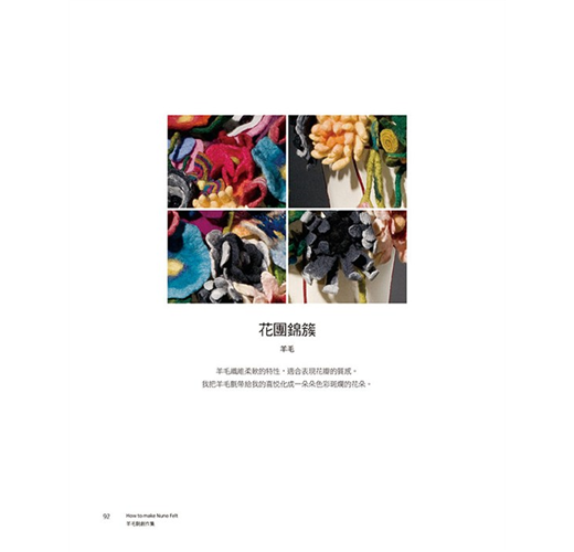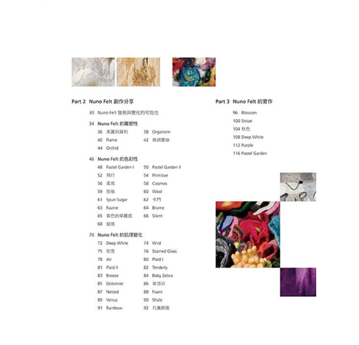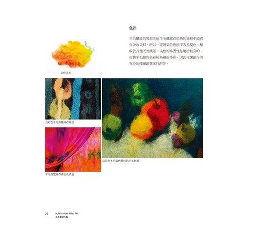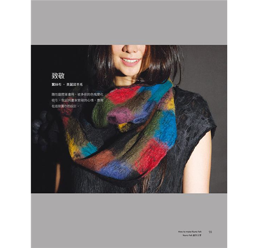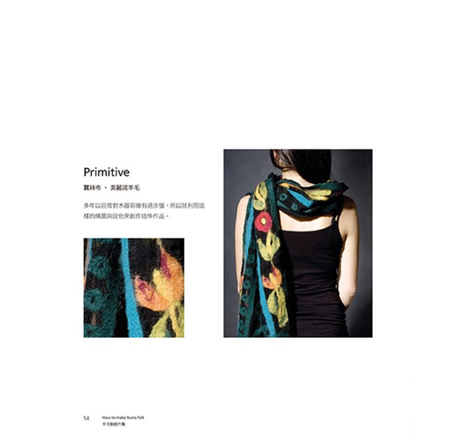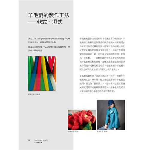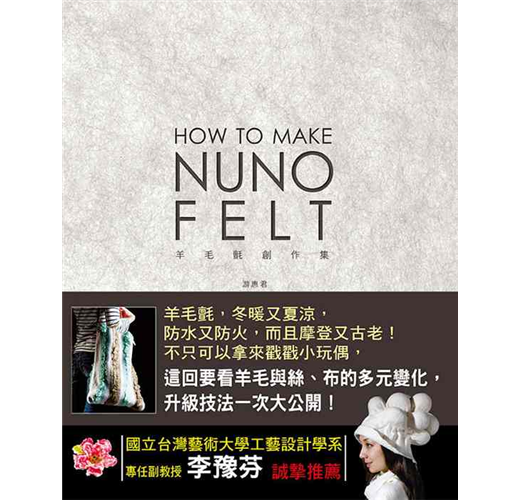 羊毛氈工藝本變化多端,羊毛氈成品可硬挺,可柔軟,可捏塑,可定型,可製做大型作品,亦可製作精巧的小物。本書作者為了展現羊毛涼爽舒適的特性,開始實驗將羊毛鋪設在天然纖維「棉」、「麻」、「絲」等天然纖維織品上,也就是使用不同纖維材質與羊毛複合,此一工法稱為「nuno felt」,並以個人研究及創作經驗詳析Nuno Felt工法的發展與變化的可能性,且將羊毛當作是纖維的天然接著劑,利用羊毛纖維的自然氈縮特性,讓羊毛纖維與纖維相互氈化咬合,創作出許多令人驚艷的作品,並針對色彩、肌理變化、藝術特性進行分析,完全顛覆一般人對羊毛氈工藝作品的印象,由書中每一項作品即可窺得羊毛氈的多變且多元的美麗風貌。