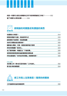 本書說明時間管理、提高平均時間生產力,以及增加工作質與量的方法。前半部介紹時間的價值,以及進行時間管理時應有的心態;後半部則介紹可以具體提高生產力的各種技巧。在書末附上效率達成評核表,方便讓您檢視現階段時間管理的達成度,並根據評核結果提供改善的方針。此外,亦準備了價值地圖與時間規劃表,協助您釐清價值觀、豎立目標並做出理想的時間表。