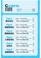 就跟中文一樣,英文無論是文章、對話、廣播、新聞……等等都會有一個主題,NEW TOEIC測驗除了我們較為熟悉的生活單字,尚有一些商業、法律、金融等較為專業領域的字彙,因此本書特別將單字依使用時機分類,讓讀者可依自己程度及需求,安排背單字的先後順序。省時又省力!透過本書,讀者可學會下列各領域的單字: