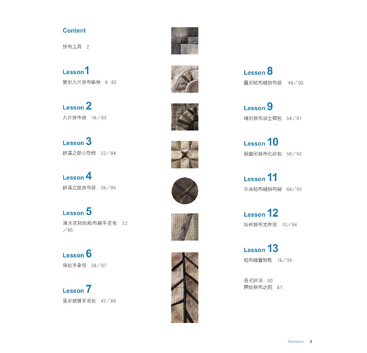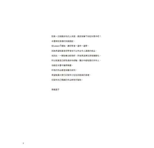 本書將從基礎的知識說起,從Lesson 1開始,讓初學者一邊作一邊學。因為希望就算是初學者也可以作出令人滿意的作品,也因此一開始會比較瑣碎,然後再逐漸加深複雜變化。所以就算是已經有過拼布經驗,屬於中級程度的手作人也能從本書獲得樂趣。