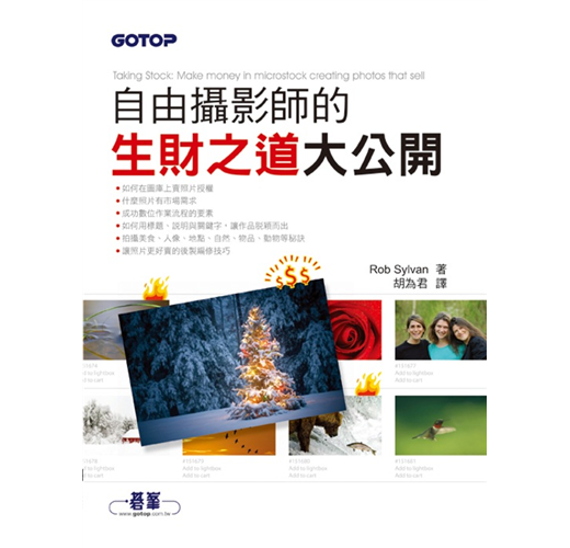 本書作者Rob Sylvan自2002年起開始擔任iStockphoto的檢查員,在這個現今最大、最受歡迎的圖庫網站上,負責決定哪些照片能上架販賣。他也自己經營生財攝影,賺進數十萬美元。若想知道如何讓自己的照片通過審核、如何讓照片更好賣,沒人比他更懂。Rob在本書中,分享了他辛苦累積的經驗,包括如何拍照、如何編輯以及如何下標籤,讓你一面學習一面賺錢。不管您是用哪一家生財圖庫網站,這些原則都適用。