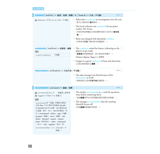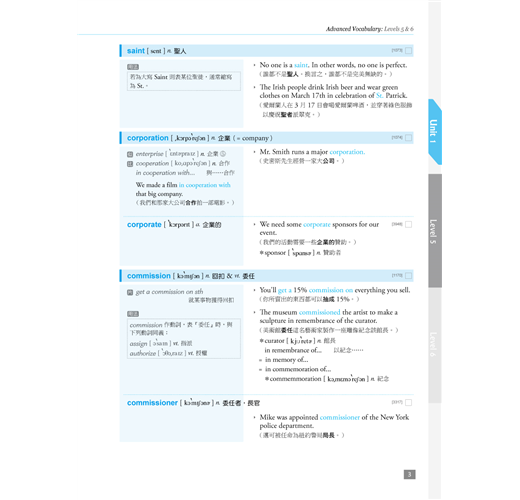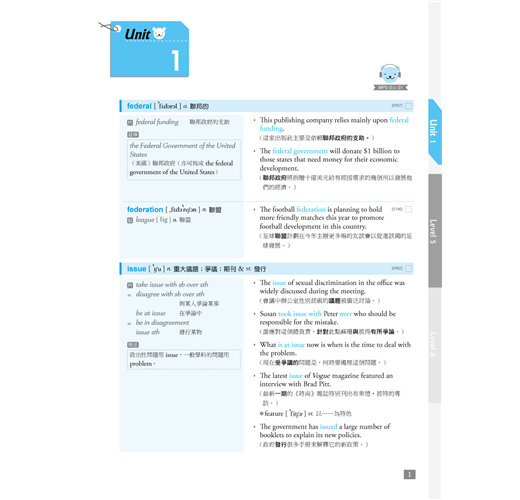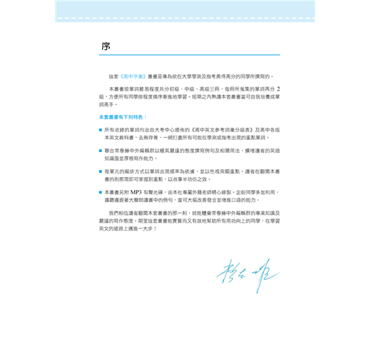 3. 每單元的編排方式以單詞出現頻率為依據,並以色塊突顯重點 。讀者在翻閱本叢書的剎那間即可掌握到重點,以收事半功倍之效。 4. 本叢書另附 MP3 有聲光碟,由本社專屬外籍老師精心錄製。企盼同學多加利用,邊聽邊跟著大聲朗讀書中的例句,當可大幅改善發音並增進口語的能力。
