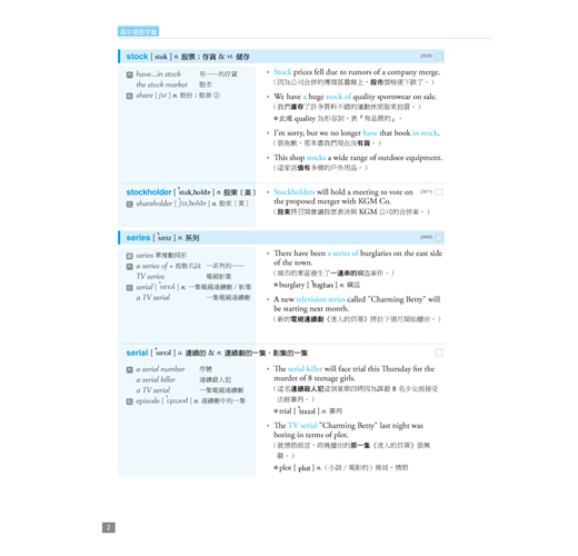 這套《高中字彙》叢書是專為欲在大學學測及指考勇得高分的同學所撰寫的。 本叢書按單詞難易程度共分初級、中級、高級三冊,每冊所蒐集的單詞再分 2 級,方便所有同學按程度循序漸進地學習。短期之內熟讀本套叢書當可自我培養成單詞高手。