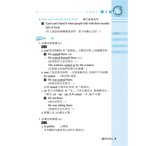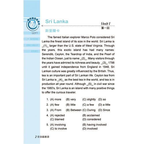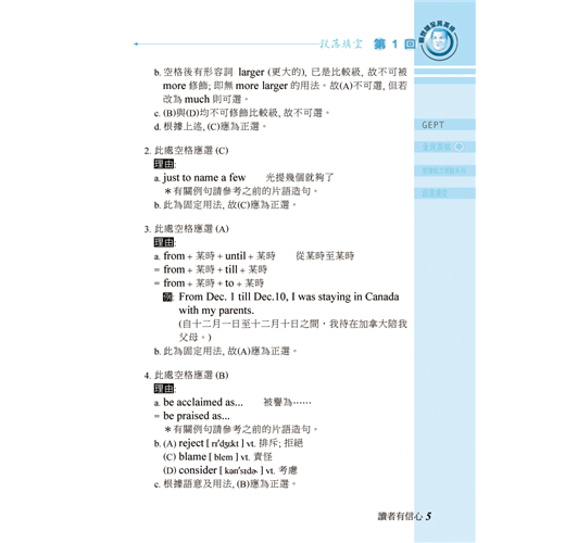 2.「段落填空」即高中聯考的「克漏字測驗」。此類考題範圍極廣,舉凡單字、片語、介詞、時態、文法句構等,皆命題所在。