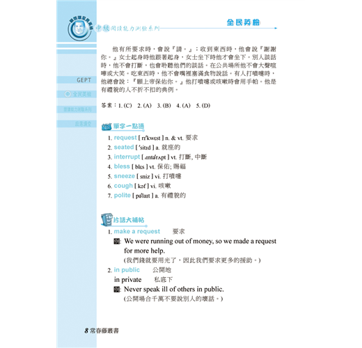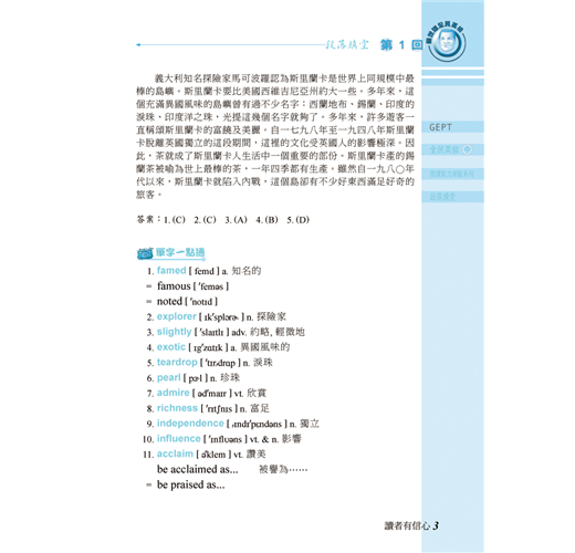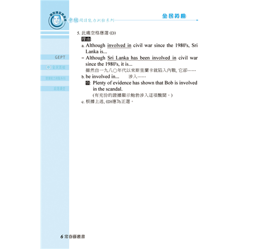 3.本書提供每篇測驗文章重要的單字、片語、文法及句型等,並附有實用例句;深入解析、易學易懂,讓您厚植應考實力。