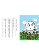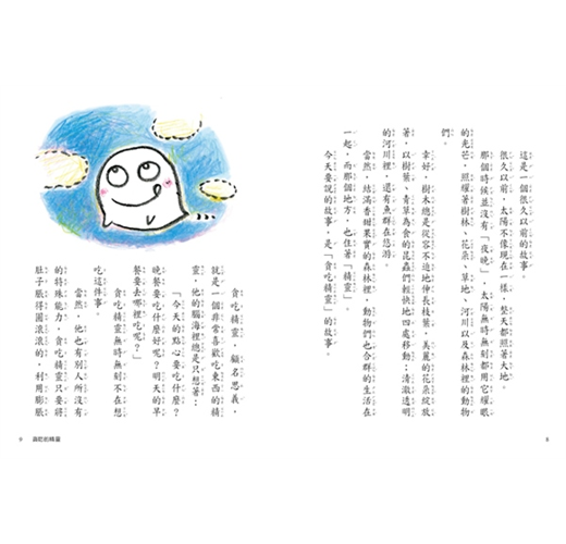 當然,他也有別人所沒有的特殊能力,貪吃精靈只要將肚子脹得圓滾滾的,利用膨脹的大肚子往天空一跳,便可以跳得又高又遠。而且貪吃的精靈不挑食,只要是可以吃的東西,他都覺得好吃,所以身體就像是一朵積雨雲般,總是圓嘟嘟的,快樂的飄在天空中。