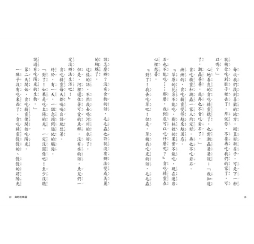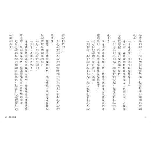 漸漸的,貪吃精靈變得越來越困惑了。「草原的花朵不能吃、森林裡果實不能吃、連岩石也不能吃……那麼,我到底可以吃什麼呢?」貪吃精靈在心裡想著。