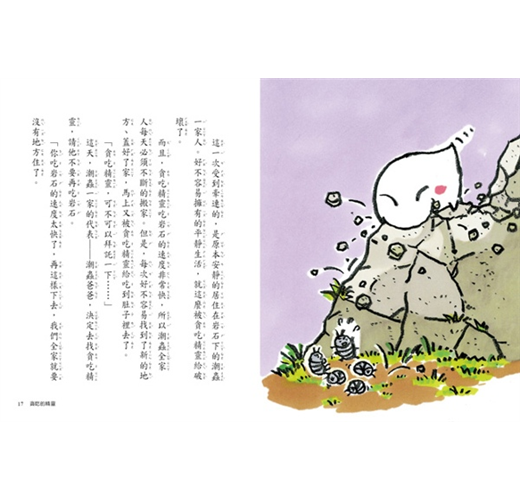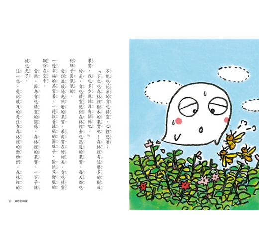 接著,貪吃精靈又開始想,要怎麼樣才不會造成蜜蜂和森林裡動物們的困擾呢?於是,貪吃精靈想到了。