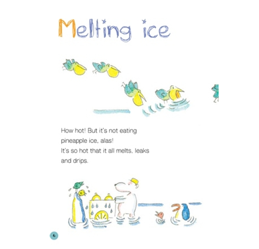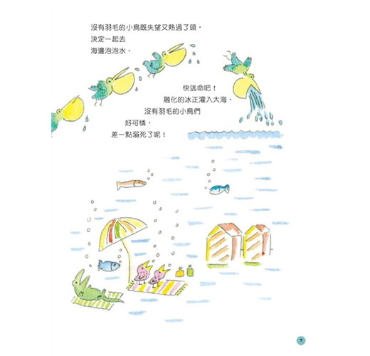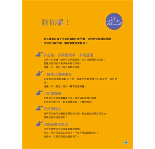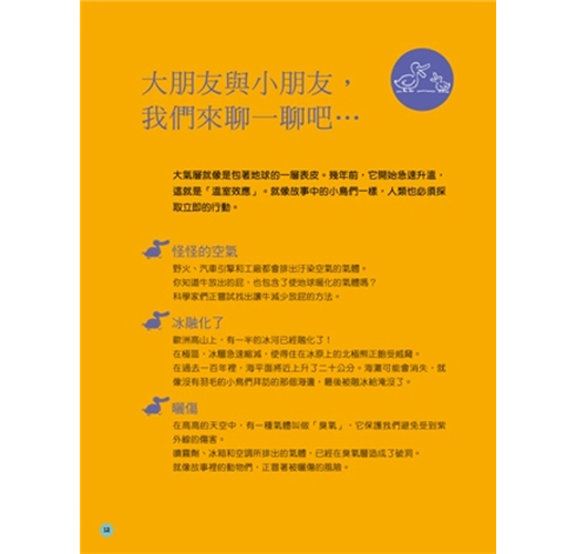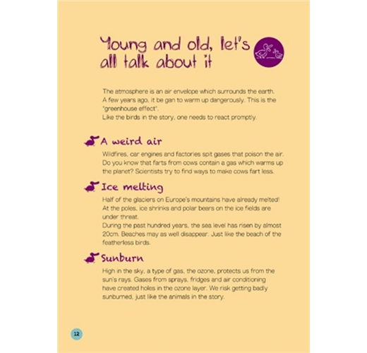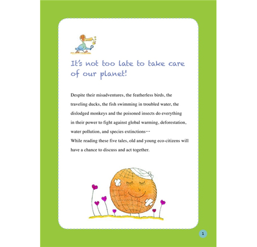 在這本關於環境保育的童話書中,共有五個小故事,「沒有羽毛的小鳥們」、「小鴨鴨去旅行」、「巨龍與恐龍」、「海底派對」、「侵略者」,儘管故事中的小動物們─如在污水中游泳的魚、離鄉背井的猴子和中毒的蟲蟲經歷了不幸的遭遇,他們還是竭盡所能對抗全球暖化、森林消失、水源汙染、以及物種滅絕……父母在陪讀、共讀的同時,可與孩子一起討論和行動。