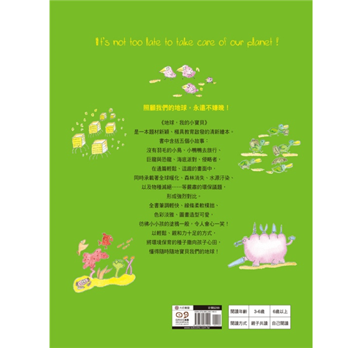 全書筆調輕快、線條柔軟樸拙、色彩淡雅、造型可愛的圖畫,彷彿小小孩的塗鴉一般,以輕鬆、親和力十足的方式,將環境保育的種子撒向孩子心田,自然而然,騰出一片清新,孕育出重視生命和環境的花朵果實,懂得隨時隨地寶貝我們的地球。