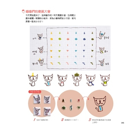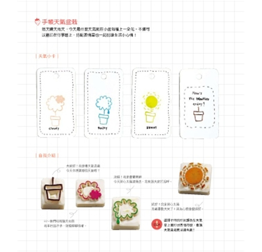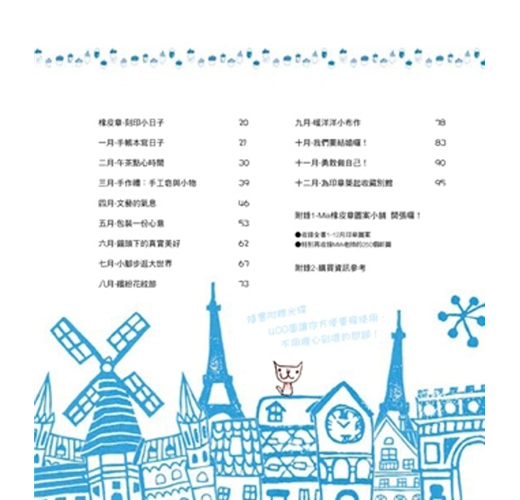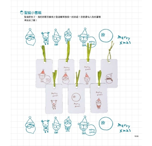 書中以1~12個月份來分類,主要想法與呈現的主軸是能將橡皮章帶入生活日子中,希望不僅是橡皮章的圖案與生活有關,就連橡皮章的運用都很生活。就好像是看一本日記和欣賞一個生活態度般,把橡皮章帶出來,看見橡皮章如何在自己的小日子一起度過。所以想將橡皮章與小日子做結合,以日常中會遇到的日子、生活點滴來切入印章主題。