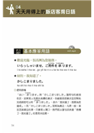 基本會話中,藉著一問一答、中日對照的設計,所有服務客人最常碰到的狀況都在這裡。平時經常演練,遇到真實情境時自然能馬上脫口而出。