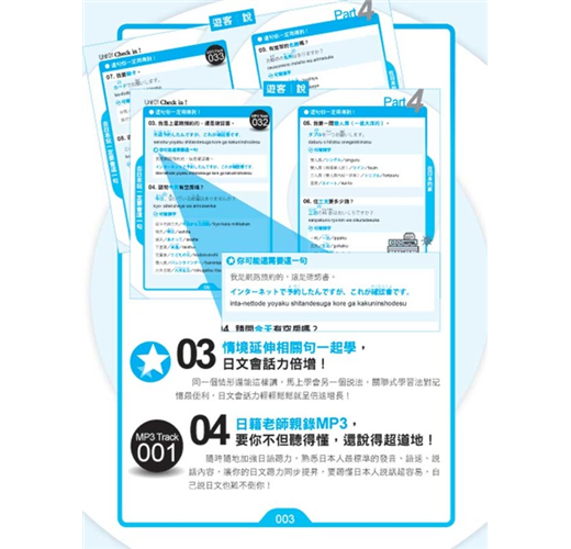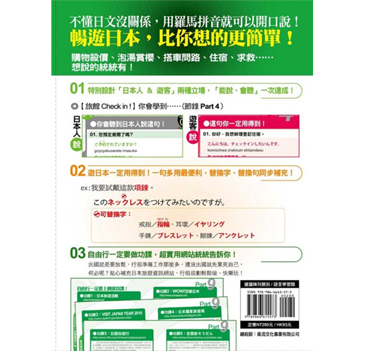 特別設計「日本人&遊客」兩種立場,不僅要會說,還要能聽懂!出國旅遊光會用日文表達還不夠,殺價、問路如果聽不懂對方的回應,等於白搭,聽懂日本人說啥才能真正溝通無礙!每個情境下特別收錄日本人最有可能跟你說的話,全部搭配中文解釋與羅馬拼音,馬上理解日本人在說什麼,不用再害怕日本人跟你嘰哩呱啦一長串卻聽攏無,再也不怕雞同鴨講!