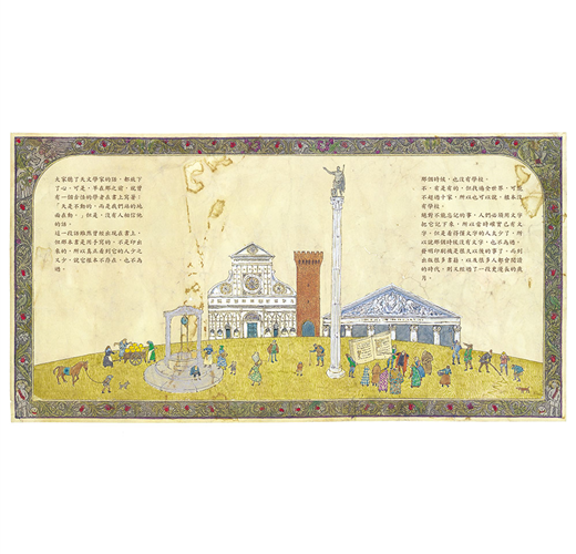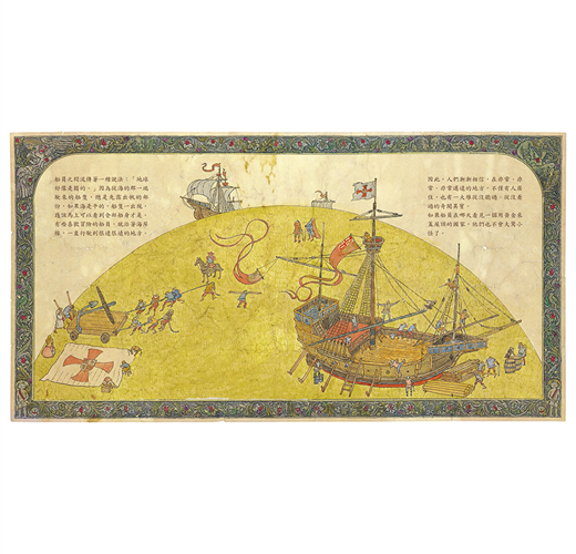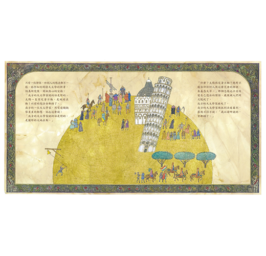 安野光雅最大的特色便是兼具科學家的頭腦和藝術家的手,他用泛黃的底紙、精心設計的藝術邊框,帶領讀者進入歐洲中古世紀,一個相信「地是平的」的年代。