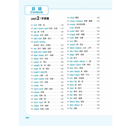 字首、字根、字尾皆衍生五個相關單字,加強讀者對字源的練習。另外,