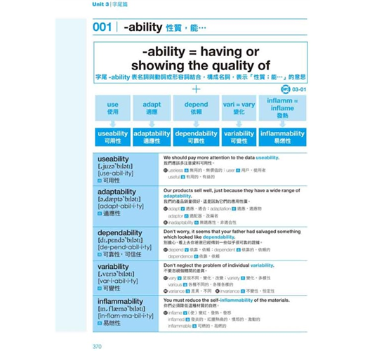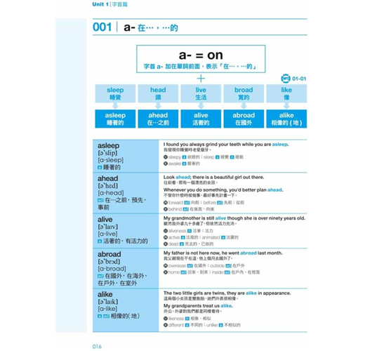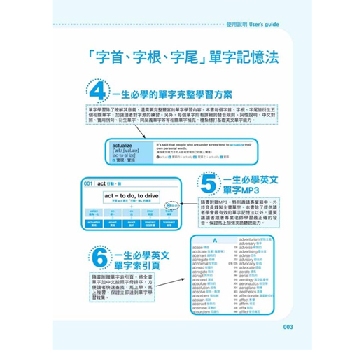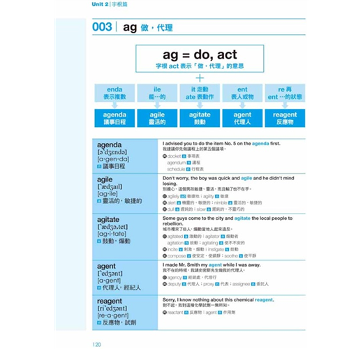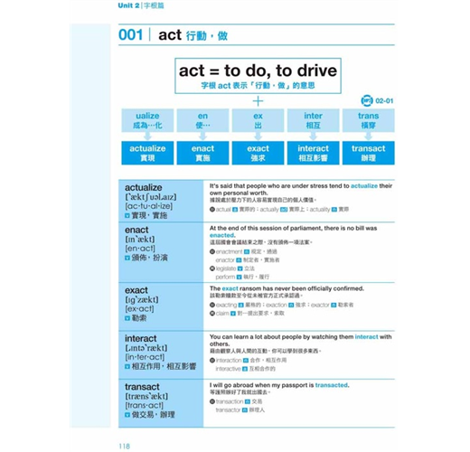 每個字首、字根、字尾皆衍生五個相關單字,每個單字附有詳細的