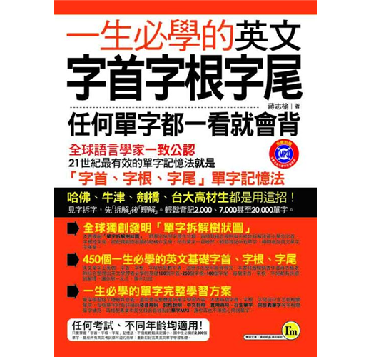如果你還因為準備某種英檢考試而購買一本單字書的話,那你就錯了!其實大學學測或指考、全民英檢、新多益、甚至是留學考試托福、雅思等任何考試考來考去都考那些單字。如果要為每一種考試而購買一本單字書研讀的話,真的可以念完整本嗎?而且我相信裡面單字重複的頻率也是可想而知的。所以,想要有效地準備任何英檢考試其實很簡單,只要學會一套有效的單字記憶法之後,任何考試、任何單字都不是問題。《一生必學的英文字首字根字尾》一書中提供了 兩大學習特色,讓讀者更穩紮穩打的奠定英文基礎: