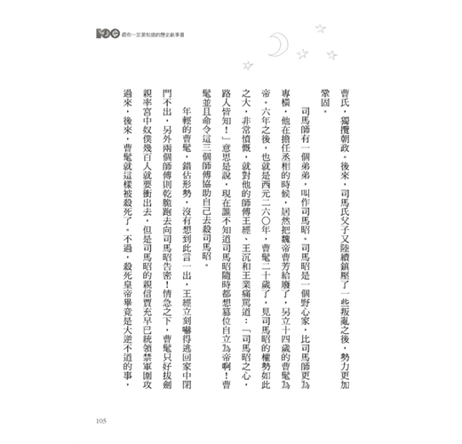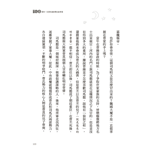 一、取材精當:這部書精選了一百個小朋友最應該知道的歷史事件,從重要的歷史人物切入,按時間先後,從上古開始,寫到民國成立。小朋友在最短的時間內,可以獲得有系統、完整、全面的歷史知識。