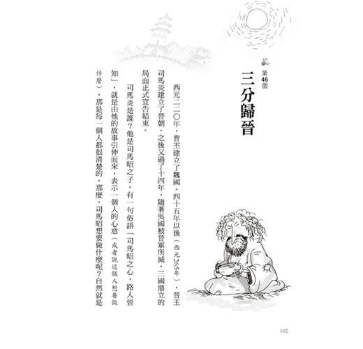 二、內容豐富:這部書裡的內容,包含各朝代的興起和沒落,國君名臣的行事,指南針、紙張等器物的發明,科舉制度、變法的介紹,老子、孔子、王充等思想家的簡介,管仲、晏子等政治家的行宜,建安七子、田園詩人陶淵明、詩仙李白、詩聖杜甫的為人和作品特色,醫聖張仲景、書聖」王羲之、畫聖顧愷之的故事,一字千金、紙上談兵、圖窮匕見、先發制人等成語典故的由來等等。內容真是豐富。