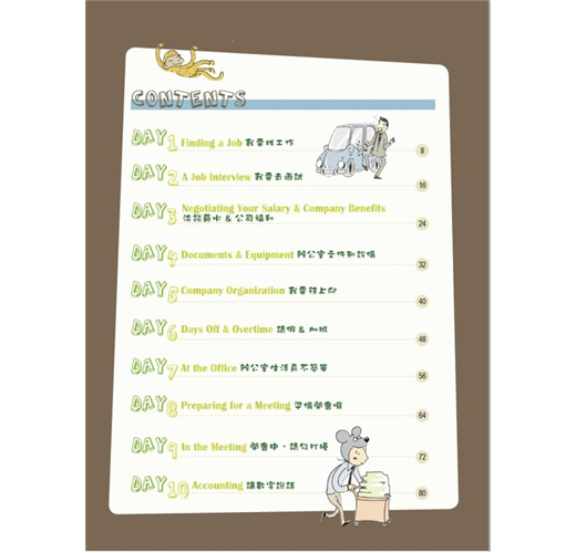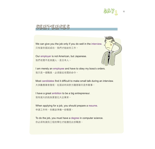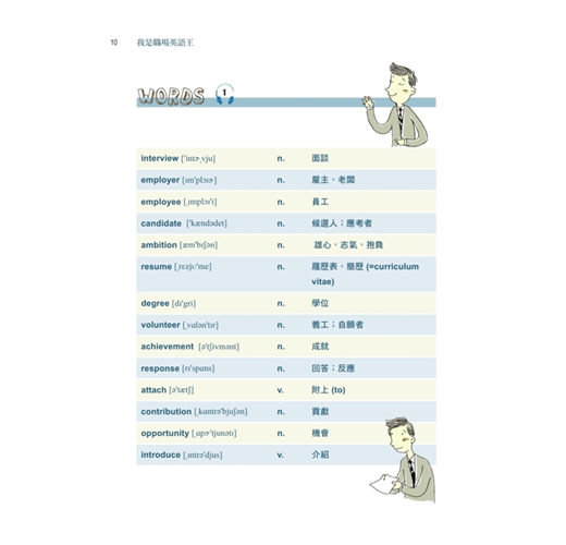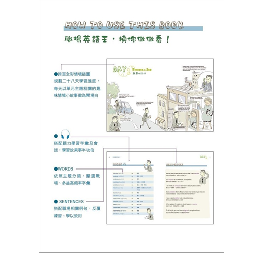 「求職」、「升遷」,再也不是Impossible!主題多樣化,職場情境一網打盡!精選職場中最實用的28個主題,包含準備面試、辦公室生活、商務出差、簡報、客戶服務等題材,還能教你如何洽談薪水、成為行銷達人……豐富多樣的情境對話,激發千萬上班族學習興趣!