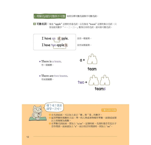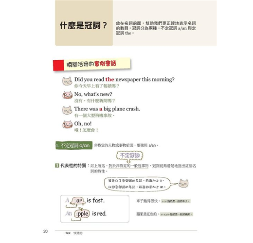 本書教你把英文句子變簡單:直接把主詞看作“A student”,動作是” is sitting”,句義「一個 [來自德國的] 學生坐在前排」就很容易理解了。看到一個英文句子,不需要急著去思考「關係代名詞在句子中的作用為何…」等理論,而是從圖解中輕鬆看懂英文的句義,當你「習慣」了這樣的用法之後,英文文法就自然而然地學起來了,根本不需要去死記硬背!