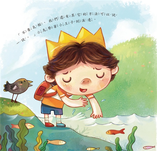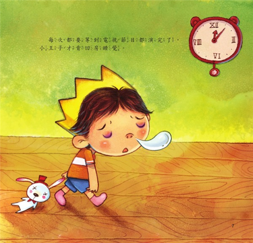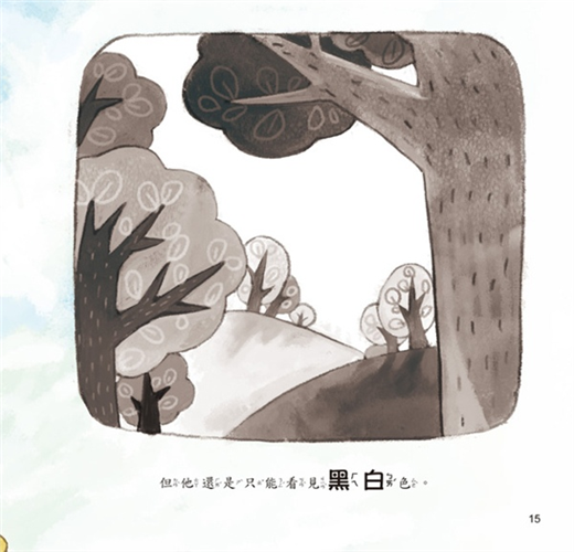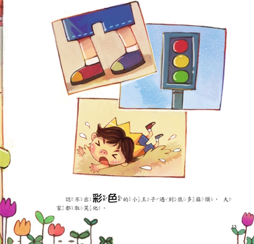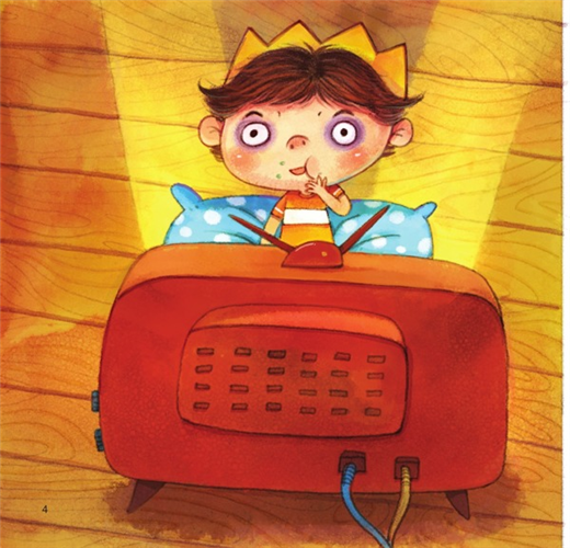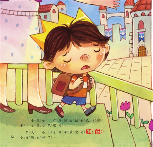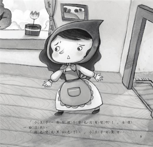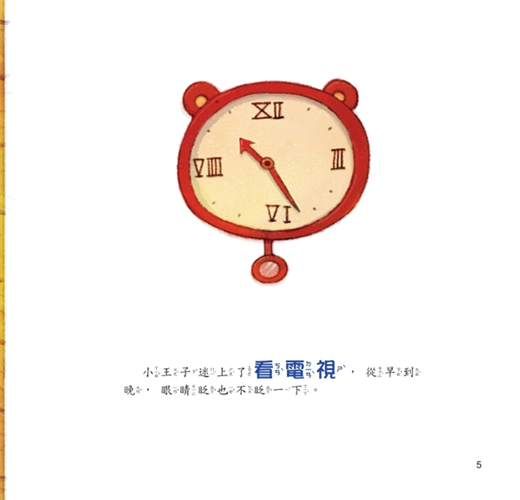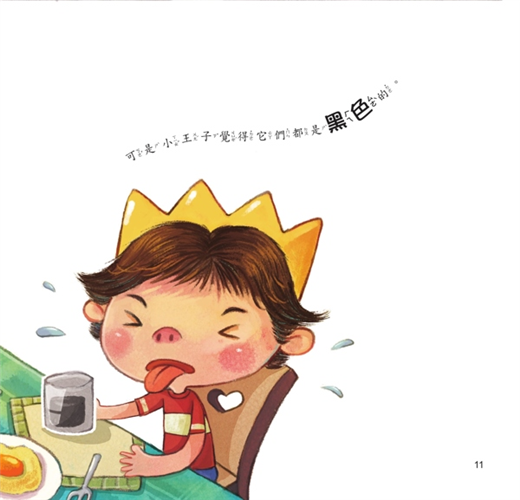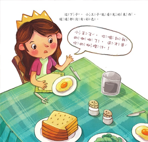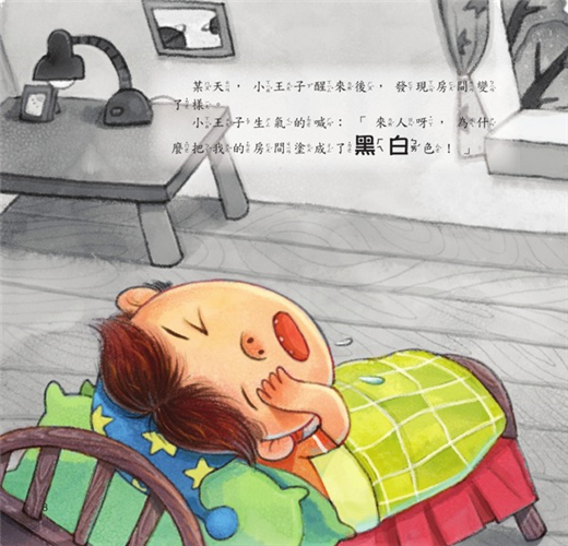 小王子就是個電視迷,早也看晚也看。可是某個早上起來,他只看得見黑色和白色。喝不了最喜歡的柳橙汁,穿錯了最喜歡的小鞋子,沒有色彩還真是麻煩耶。