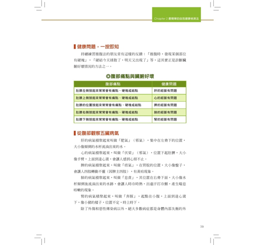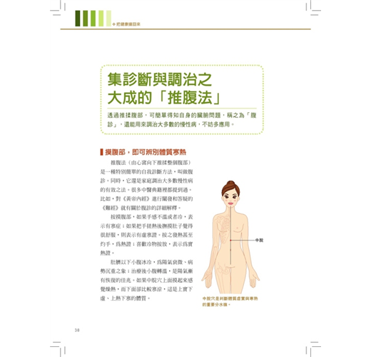 ◎集診斷、調治於一體的極簡自測法──“腹診法”由心窩向下推揉整個腹部,如果發現有痛點、硬塊或結點,即代表對應的五臟或經絡出現問題,讓你快速找出病根來。
