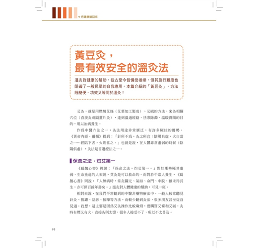 ◎每個家庭必備的健康傳家寶──“黃豆灸法”、“懶人自我調養的一招三式”等針對自己的不適,除了找醫師診治外,在家中也能選擇相應的方法,雙管齊下,讓你快找回健康。