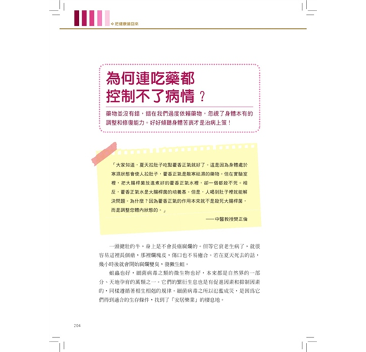 本書整合現代人因快速繁忙的生活,容易導致的各種健康狀況,