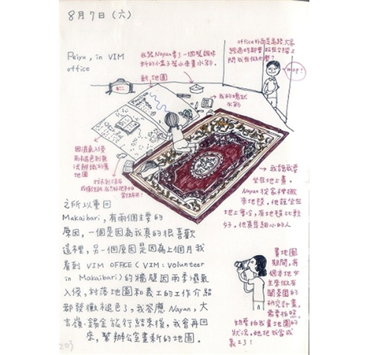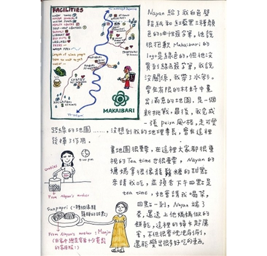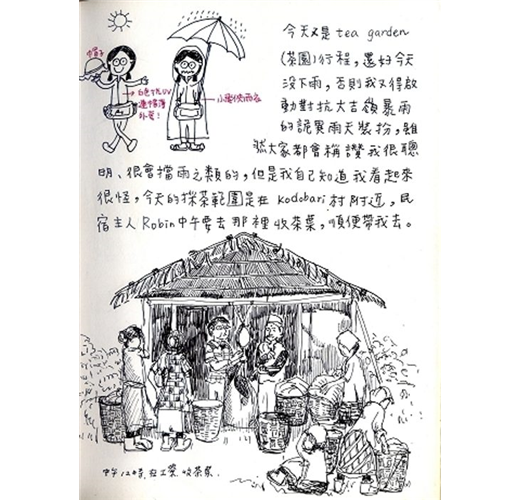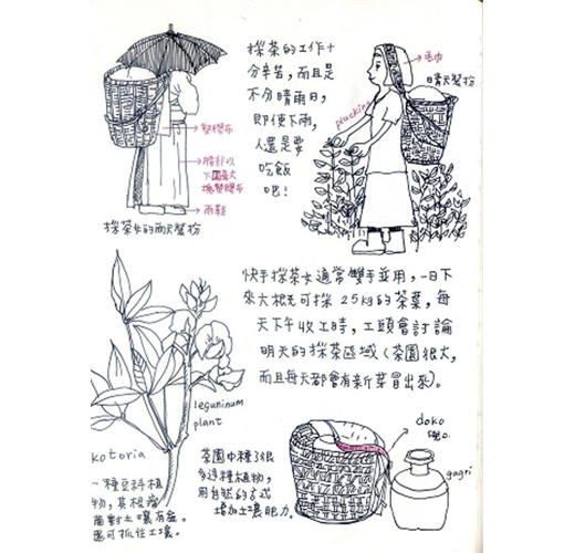 跟著當地人,憑著雙手的簡單勞動帶來生活的踏實感,第一次背起茶簍當起了採茶女工、在茶廠裡跟著學會如何烘焙茶葉、一邊閒話家常一邊揀去茶枝,認識了「有機農業」和「公平貿易」如何為當地村落帶來新的希望,後來更當起了辦公室的義工,為茶廠繪製了村落地圖和海報……