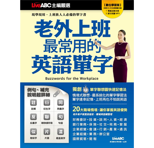 英語是增進職場競爭力、在商場上衝鋒陷陣的必備武器,此書能幫助讀者不再在同事及老闆面前抬不起頭來、在客戶面前出糗。本書精心匯整出20大類職場上最常見的商務主題,列出了1600個實用商務字彙,讓讀者不用再猛K字典背一大堆單字,也能讓英語字彙能力在各種職場與商務情境中游刃有餘。每個單字都有詳盡的相關補充,包括例句、同義字、反義字、衍生字、聯想相關字詞、片語及句型或常用句等。針對一般人可能較不了解的詞彙,書中也特別加增註解,讓讀者不但能學到這些單字,也能增添對基本商務知識的了解。