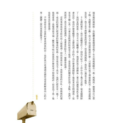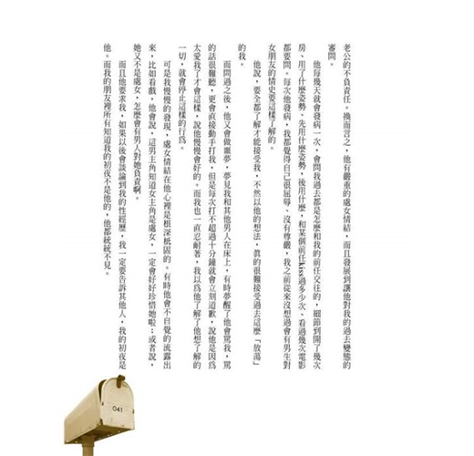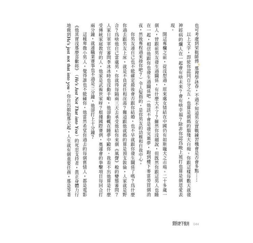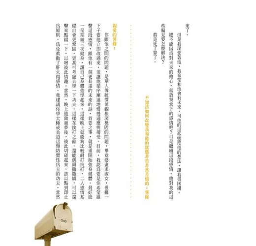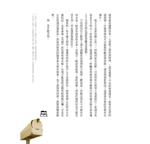 老實講,在看這本書以前,我其實有點害怕這種愛情信箱式的文體,至怕的,就是信箱主人本著我佛慈悲的心情廣愛世人,永遠安慰人家「你值得更好的」、鼓勵人家「遲早有天幸福會來」,總之來信的跟回信的相濡以沫,一個虔誠一個慈悲,完全是上下交相賊,郵箱裡端地是風調雨順,但真實世界依舊天地不仁,這個被誇獎鼓勵為「值得更好的對象」「遲早會得到幸福」的曠男怨女最後到底是成功上岸、還是繼續慾海沉淪,誰又真的在意了?