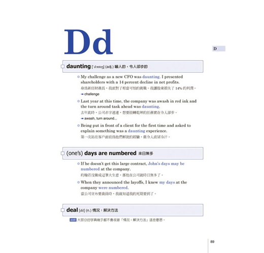 本書的單字、片語涵蓋各種情境場合,從商務應酬、同事間的對談到宴會中的對話等。所有的單字、片語都搭配數個例句,以提供不同情境下的使用方法,讓讀者更能活用這些詞彙。而為了幫助讀者熟記這些詞彙,詞彙會反覆出現在不同的例句中,以加強讀者的印象。