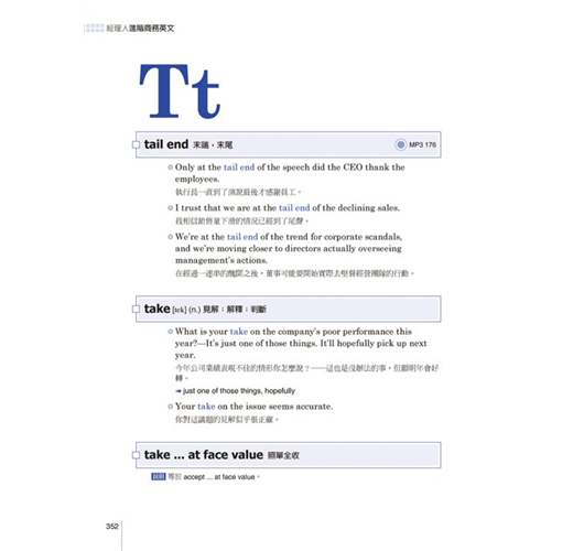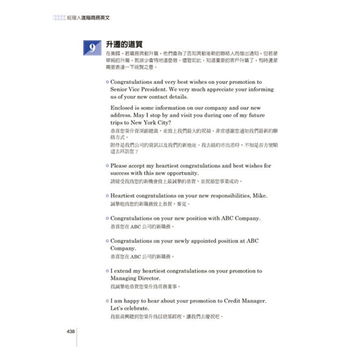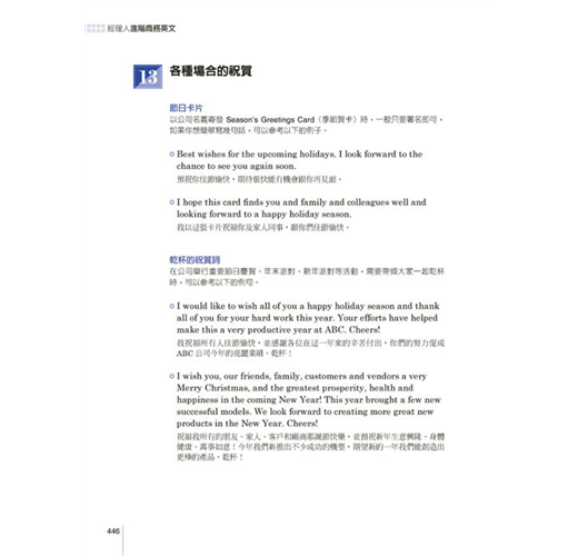 本書的附錄收錄了一些相當實用的生活實務範例,從電子郵件自動答覆範例、致謝詞、祝賀詞到常見錯誤用法等。本書的內容對商務人士特別有幫助,能讓他們在英文的溝通表達上更道地。