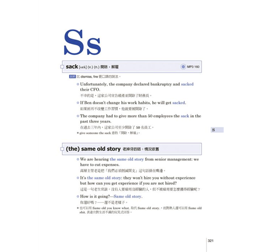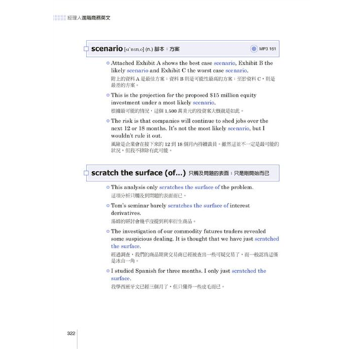 本書的單字、片語涵蓋各種情境場合,從商務應酬、同事間的對談到宴會中的對話等。所有的單字、片語都搭配數個例句,以提供不同情境下的使用方法,讓讀者更能活用這些詞彙。而為了幫助讀者熟記這些詞彙,詞彙會反覆出現在不同的例句中,以加強讀者的印象。...