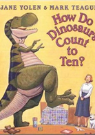 Describes how a little dinosaur counts from one to ten, using the toys and other things around him. On board pages.