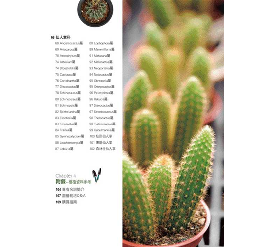※隨書附錄「專有名詞簡介」、「園藝栽培Q&A」、「台灣仙人掌與多肉植物園簡介」及「購買指南」,讓讀者快速進入仙人掌與多肉植物的世界。