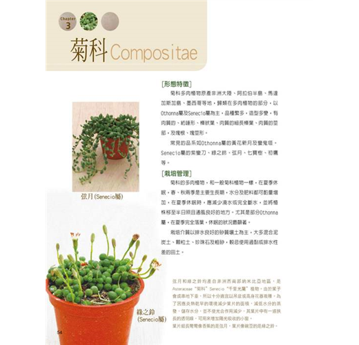 ※介紹仙人掌與多肉植物之品種、四季管理及栽培方法,內容深入淺出,讓讀者明瞭其生長習性並落實栽培過程。