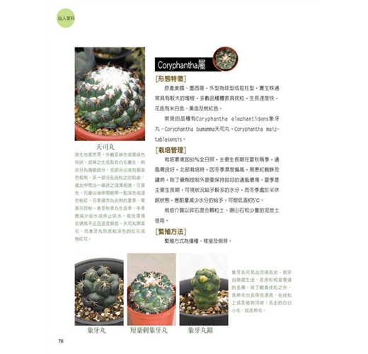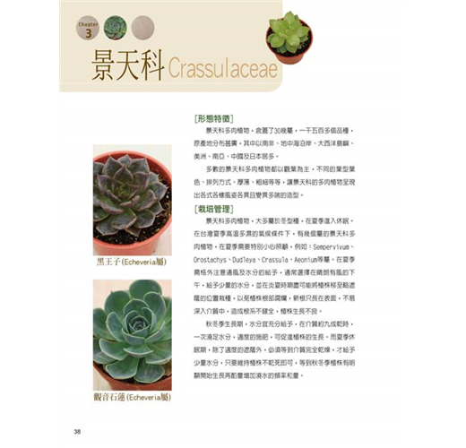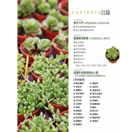 書中植物依「科」、「屬」分類,介紹目前流行的植物具體栽植管理法,以圖文並行的形式展示了380個品種,深入淺出的說明讓新手也能對仙人掌與多肉植物更深入認識。