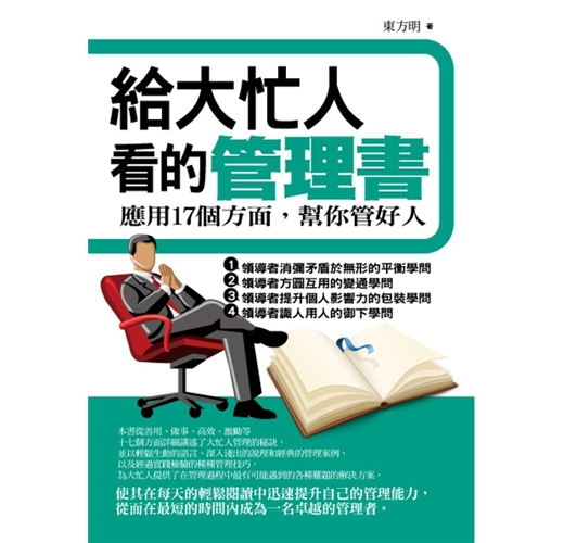 本書從善用、做事、高效、激勵等十七個方面詳細講述了大忙人管理的秘訣,並以輕鬆生動的語言、深入淺出的說理和經典的管理案例,以及經過實踐檢驗的種種管理技巧,為大忙人提供了在管理過程中最有可能遇到的各種難題的解決方案,使其在每天的輕鬆閱讀中迅速提升自己的管理能力,從而在最短的時間內成為一名卓越的管理者。