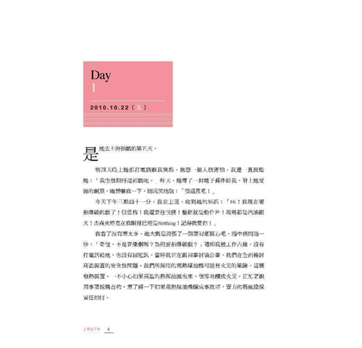 Day 120 1 0 . 1 0 . 2 2(五)今天是她去上海拍戲的第五天。前四天晚上她都打電話跟我哭訴,抱怨一個人很害怕,我還一直鼓勵她:「我也很期待這部戲呢。」昨天,她寄了一封電子郵件給我,附上她受傷的劇照,她想嚇我一下,開玩笑地說:「很逼真吧!」今天下午三點四十一分,我在上班,收到她的短訊:「 Hi!我現在要拍爆破的戲了!很恐怖!我還要往前撲!整個就是動作片!現場都是汽油跟火!傑森史塔克在我眼裡已經是 Nothing!記得我愛你!」我沒有即刻看到這個簡訊,看到時也沒有想太多,她大概是像昨天一樣又想嚇我一下,或是誇張了一...