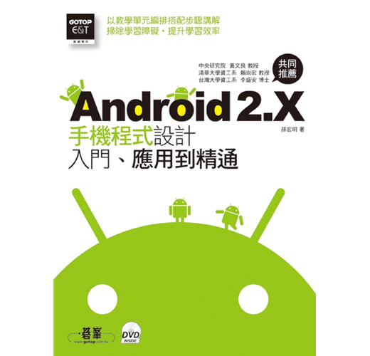 『推薦大家這本由孫老師精心編寫的Android教學書籍,其中包含許多重要主題單元,內容非常豐富,討論了非常多的例子。這是一本非常好的學習手冊與工具書,非常適合已具備Java語言基礎,要學習Android程式開發的讀者。』--台灣大學資工系 李盛安 博士--