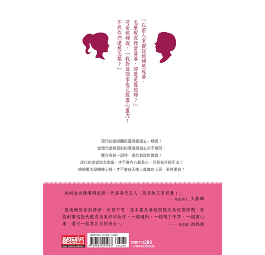 但只要展讀吳老師的書,也許就能夠體會出吳老師的用心──專家並不是生活在對的環境中,真正的專家是在遇見不對的狀況後,還能夠修正調整,並且在過程中有所收穫的人!吳老師就是這樣的專家!早已升格為婆婆的她, 婆媳關係也不是一開始就一百分,跟我們大家都一樣,她們婆媳間同樣有過爭吵、不愉快的時候, 可是想要有好關係,就不能只是互相抱怨,而需要有人先開始「改變」。