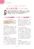 第二篇 女人一生的飲食調養指南台灣女性的成長階段概分為8大期,每個階段的身心變化都不同,營養師針對0~80S女性所需,提供最合適、適切的飲食調養指南!