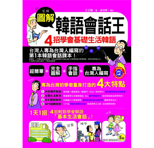 《圖解韓語會話王─4招學會基礎生活韓語》。惟有台灣人替台灣人編寫的韓語課本,才能滿足學習者的學習需求並且幫助其學習最正統的韓語生活會話。