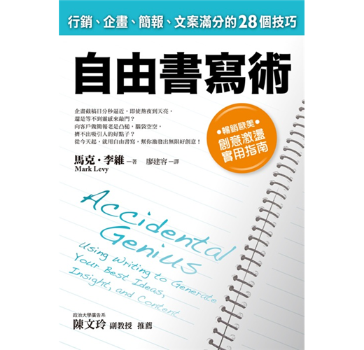 ◎馬克.李維教導讀者一個很棒的技巧──自由書寫,這個方法可以幫助你潛入潛意識的深處,挖掘出珍貴的寶藏,例如你的下一個事業投資、行銷活動或是電影劇本的點子。假如你想要開發自己天生擁有的珍貴才能,就絕對不可錯過本書。